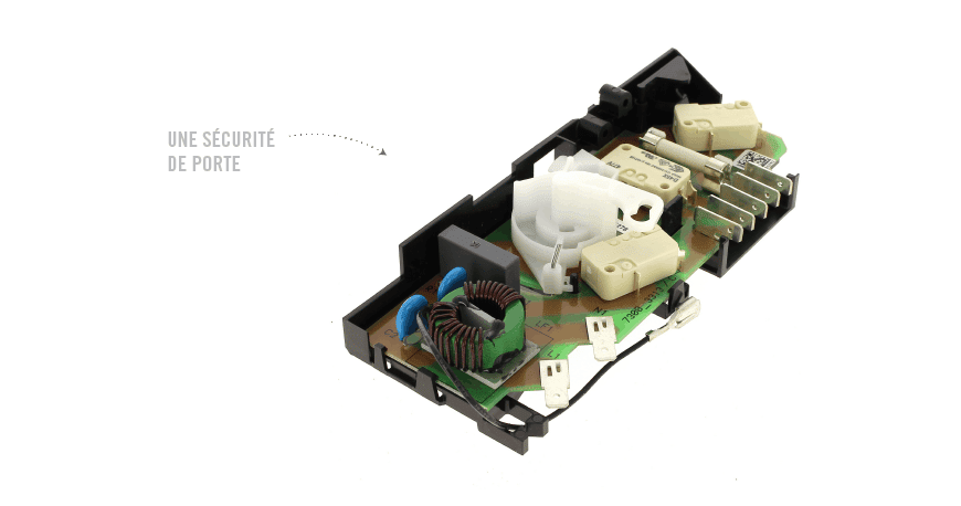 La protection de la porte permet, en cas de dysfonctionnement du système de verrouillage de la porte, de bloquer le fonctionnement de l’appareil. Il est équipé de plusieurs interrupteurs, en cas de dysfonctionnement de l’un ou l’autre des modules, le four à micro-ondes ne fonctionnera pas.